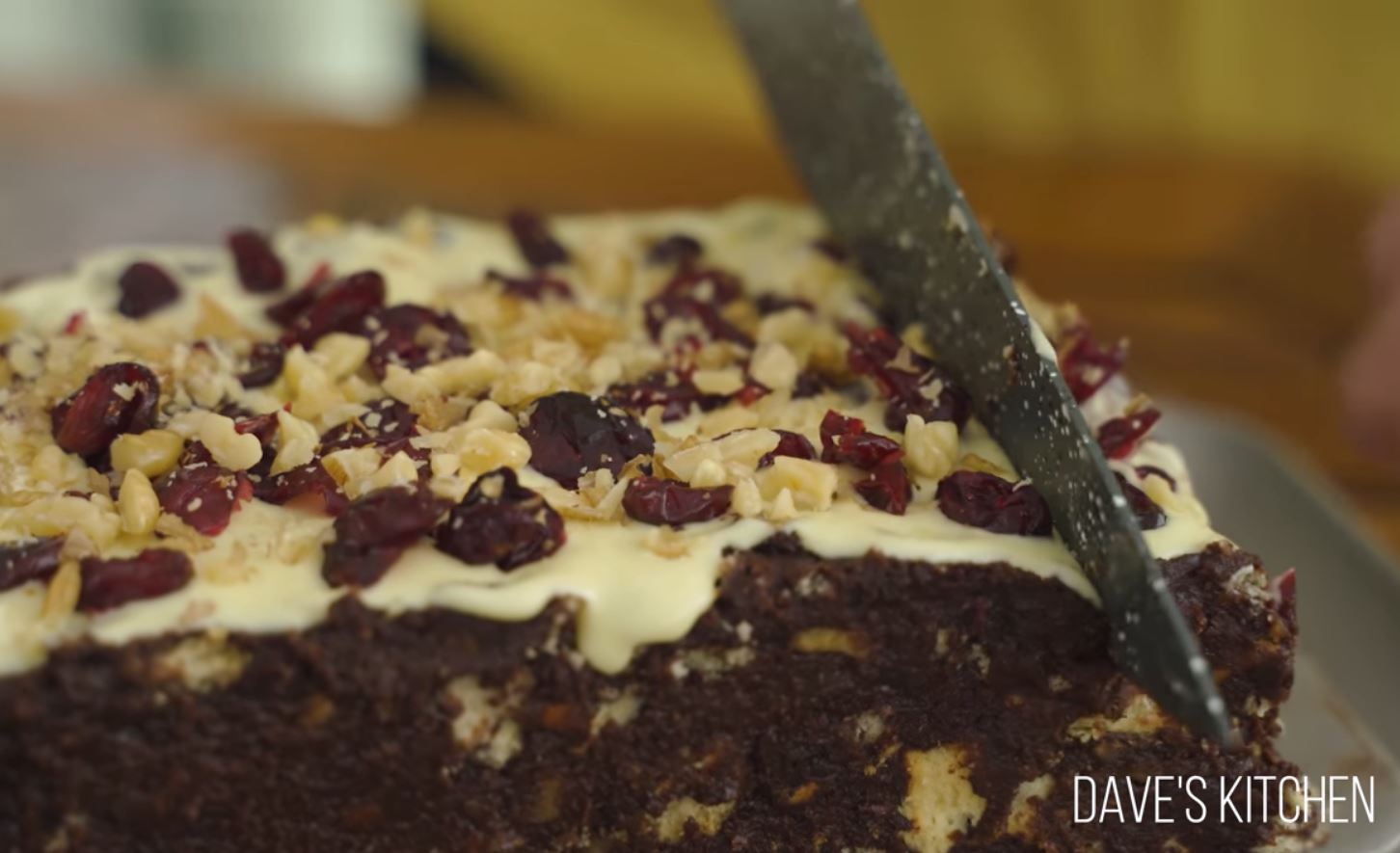 Πριν το σερβίρετε, λιώστε τη λευκή σοκολάτα πάνω σε ένα μπρίκι με τον ατμό από το νερό που βράζει από κάτω και απλώστε το πάνω μέρος του κέικ σε όλη την επιφάνεια. Γαρνίρουμε με κρανμπερυ και ψιλοκομμένα καρύδια και κομμένα σε κομμάτια.