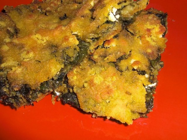 Ανακατεύουμε το καλαμποκάλευρο με νερό μέχρι να αποκτήσουμε έναν αρκετά σφιχτό χυλό. Βουτυρώνουμε καλά το ταψί (μην το λυπάστε το βούτυρο), απλώνουμε λιγότερο από τον μισό χυλό στο ταψί και τον στρώνουμε καλά με το χέρι ώστε να σχηματιστεί μια ομοιογενής λεπτή στρώση. Αδειάζουμε το μείγμα των λαχανικών και το απλώνουμε και αυτό ισομέρως. Ρίχνουμε λίγο νερό ακόμα στο χυλό, ώστε να γίνει πιο αραιός και περιχύνουμε με αυτόν τα χόρτα, κουνάμε να πάει παντού. Μόλις ισιώσουμε την επιφάνεια, ρίχνουμε λίγο ακόμη ελαιόλαδο και στρατηγικά, μερικά κομμάτια φέτα.