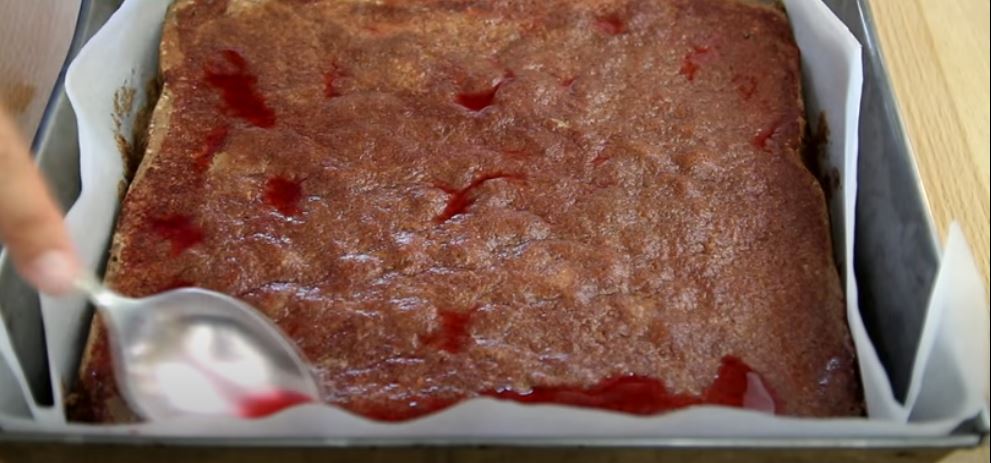 Ρίχνω τη ζύμη στο ταψί , απλώνεται σε ομοιόμορφη επιφάνεια και το βάζω σε φούρνο προθερμασμένο στους 160 βαθμούς Κελσίου.