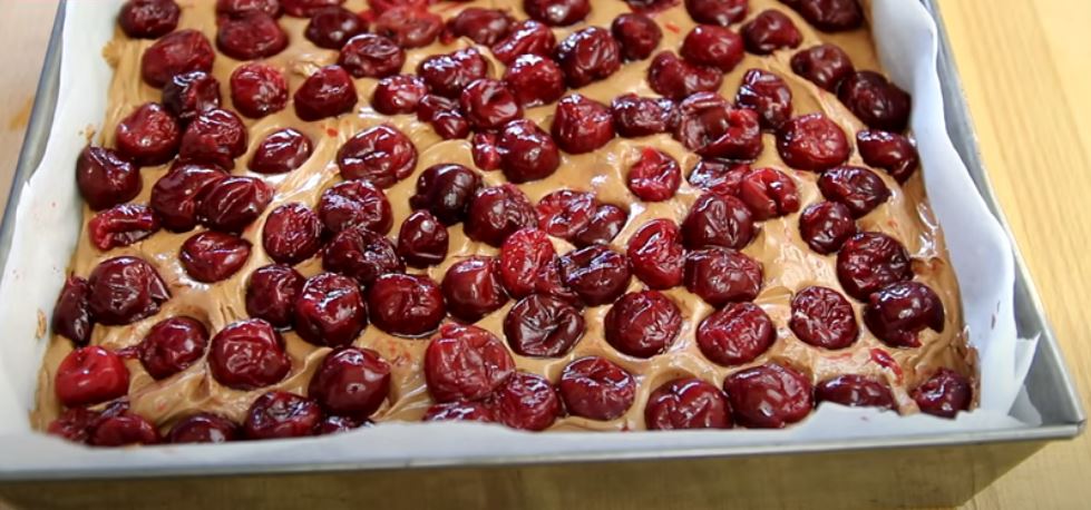 Στη συνέχεια απλώσαμε την κρέμα σε ένα ομοιόμορφο στρώμα στο παντεσπάνι, και τα στραγγισμένα κεράσια πάνω από την κρέμα, καλύπτοντας το κέικ ομοιόμορφα.