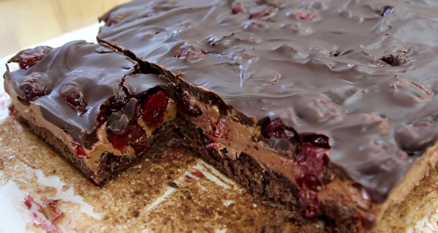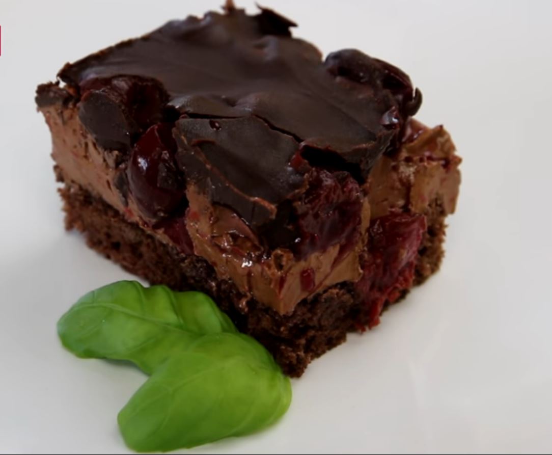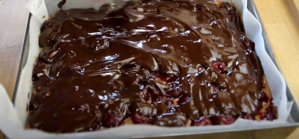 Λιώνω το βούτυρο σε μια κατσαρόλα, προσθέτω τη σοκολάτα σπασμένη σε μικρότερα κομμάτια και το λιώνω, ανακατεύοντας συχνά. Απενεργοποιώ αμέσως τη φωτιά, όταν λιώσει σχεδόν όλη η σοκολάτα, και τη λειώνω περισσότερο, ανακατεύοντας, χωρίς να τη θερμαίνω, ώστε να μην βράσει. Το αφήνω να κρυώσει ελαφρώς (μπορείτε να βάλετε σε ένα μπολ με κρύο νερό και να την βάλετε μία ή δύο φορές), στη συνέχεια ρίξτε το δροσερό γλασο απο πάνω στο κέικ και απλώστε το σε ομοιόμορφο στρώμα στα κεράσια. Και είναι έτοιμο 🙂