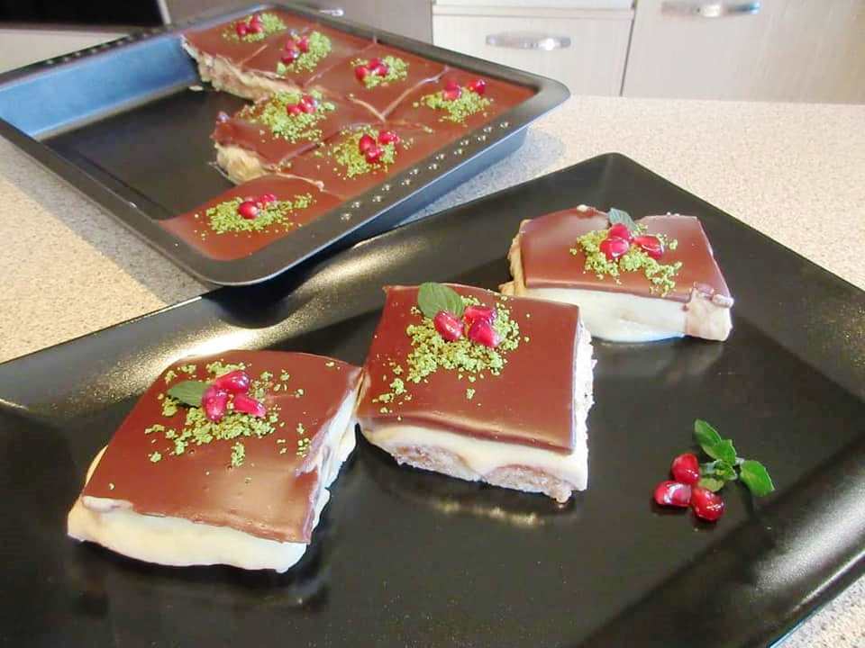 Γαρνίρετε με αλεσμένα φιστίκια Αιγίνης, τρίμματα καρύδας ή μικρά κόκκινα φρούτα – ρόδια, φράουλες, σμέουρα, ανάλογα με τις προτιμήσεις σας.