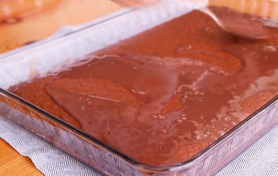 11 – Κάνουμε τρύπες στο κέικ με καλαμακι και ρίχνουμε το υγρό μειγμα παντού και αφήνουμε το κέικ να μουλιάσει.