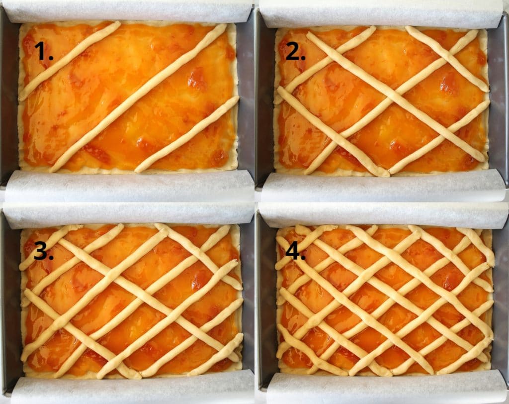 Ανακατέψτε την μαρμελάδα βερίκοκου για να μαλακώσει στην υφή της και απλώστε την ομοιόμορφα πάνω από τη ζύμη σχεδόν μέχρι τις άκρες, αφήνοντας περίπου μισο εκατοστό μέχρι τις ακμές που δεν καλύπτονται. Στη συνέχεια, πάρτε την υπόλοιπη ζύμη και