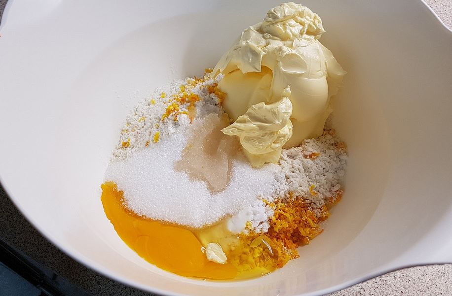 2. Σε ένα μεγάλο μπολ βάζω όλα τα υλικά: τη μαργαρίνη, τη ζάχαρη, το αυγό, το ξύσμα πορτοκαλιού, τις βανίλιες, το αλεύρι, το ρούμι ή το κονιάκ και το μπέικιν πάουντερ ή τη σόδα.