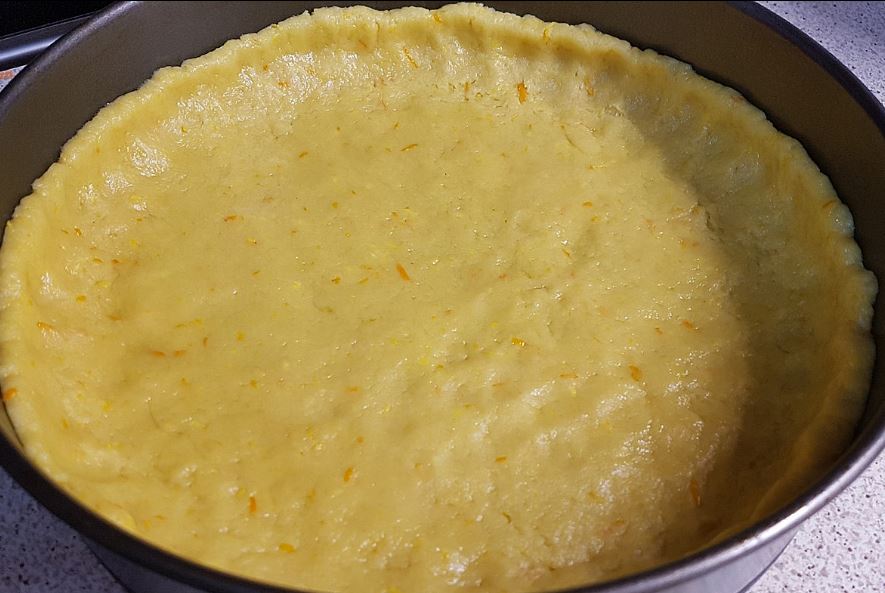 5. Παίρνω την υπόλοιπη ζύμη και την απλώνω ομοιόμορφα στον πάτο του ταψιού, υψώνοντας λίγο μια ζύμη γύρω γύρω, σαν ένα μικρό τείχος.