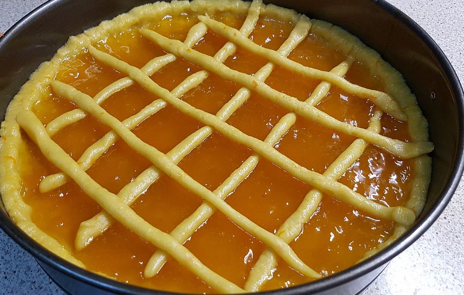 7. Με τη ζύμη που έχω κρατήσει, φτιάχνω κορδόνια και τα τοποθετώ διαγώνια πάνω από τη μαρμελάδα για να στολίσω την επιφάνεια της πάστας φλώρα.
