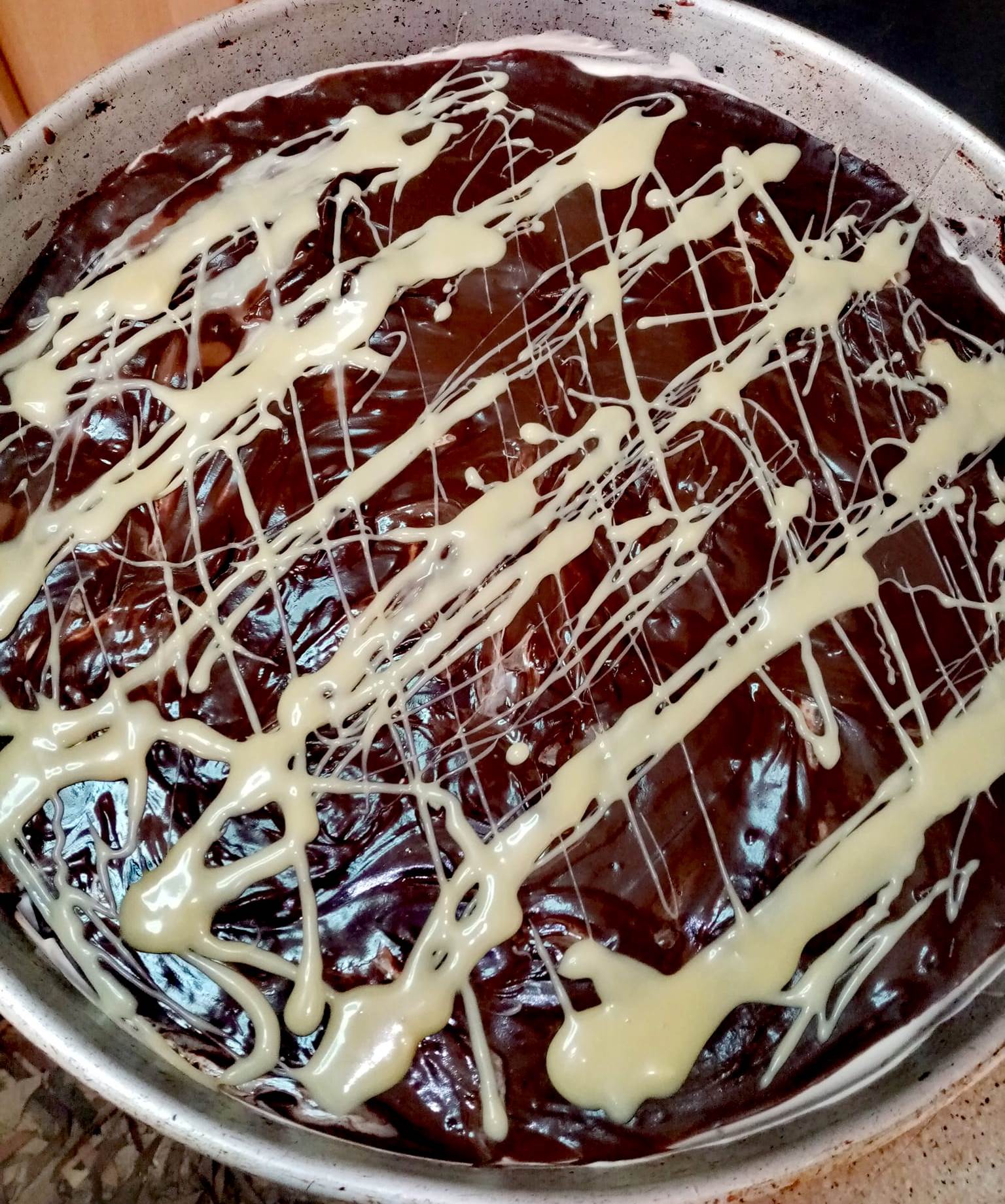 Λιώνουμε τη λευκή κουβερτούρα σε μπεν μαρί ή στα μικροκύματα. Κάνουμε γραμμές με ένα πιρούνι πάνω από το γλάσο σοκολάτας.