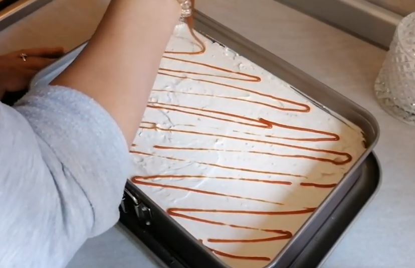 Απλώνουμε την κρέμα-καραμελέ και βάζουμε στο ψυγείο για 15 λεπτά.
