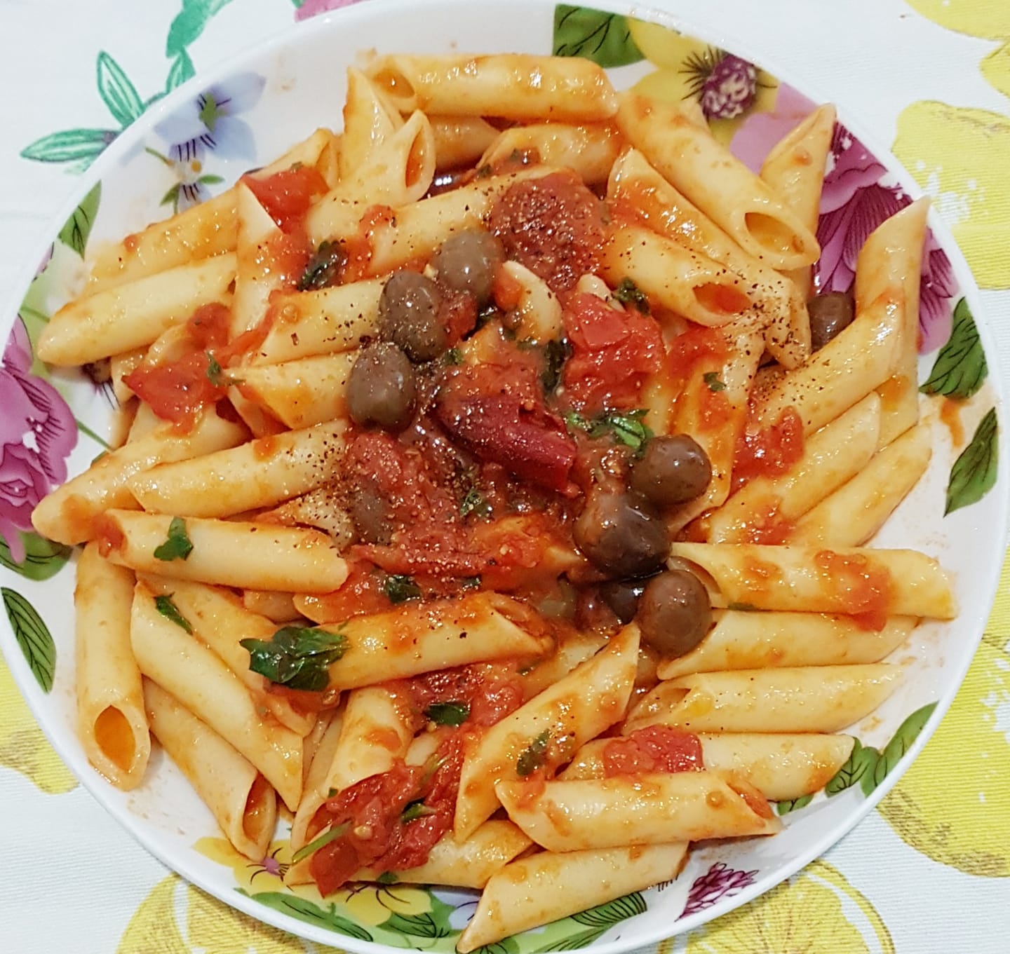 Τηγανίζουμε σε χαμηλή φωτιά, προσθέτουμε τη θρυμματισμένη αποφλοιωμένη ντομάτα, γυρίζουμε τα υλικά καλά, ρίχνουμε αλάτι και μαγειρεύουμε για περίπου 10 λεπτά, γυρίζοντας κάθε τόσο, όταν το μαγείρεμα πρόκειται να τελειώσει, προσθέστε τις ελιές κομμένες σε στρογγυλά (μπορείτε να χρησιμοποιήσετε και τις δύο πράσινες ή μαύρες σύμφωνα με τα γούστα σας).