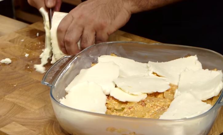 Βάζουμε τις μισές πέννες μας σ ένα πυρέξ τοποθετούμε από πάνω τη μοτσαρέλλα κομμένη