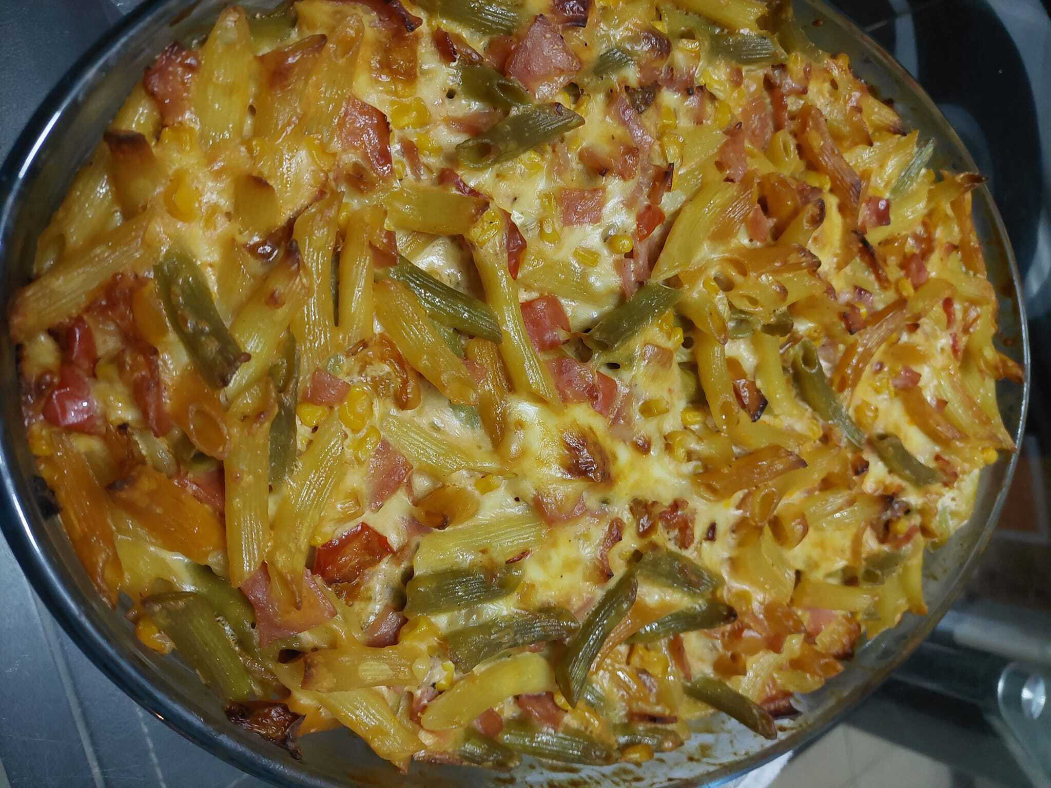 Σουρώνω τα μακαρόνια και τα ρίχνω σε πυρέξ. Προσθέτω το μείγμα με τις πιπεριές και βάζω αλάτι και πιπέρι(προσοχή