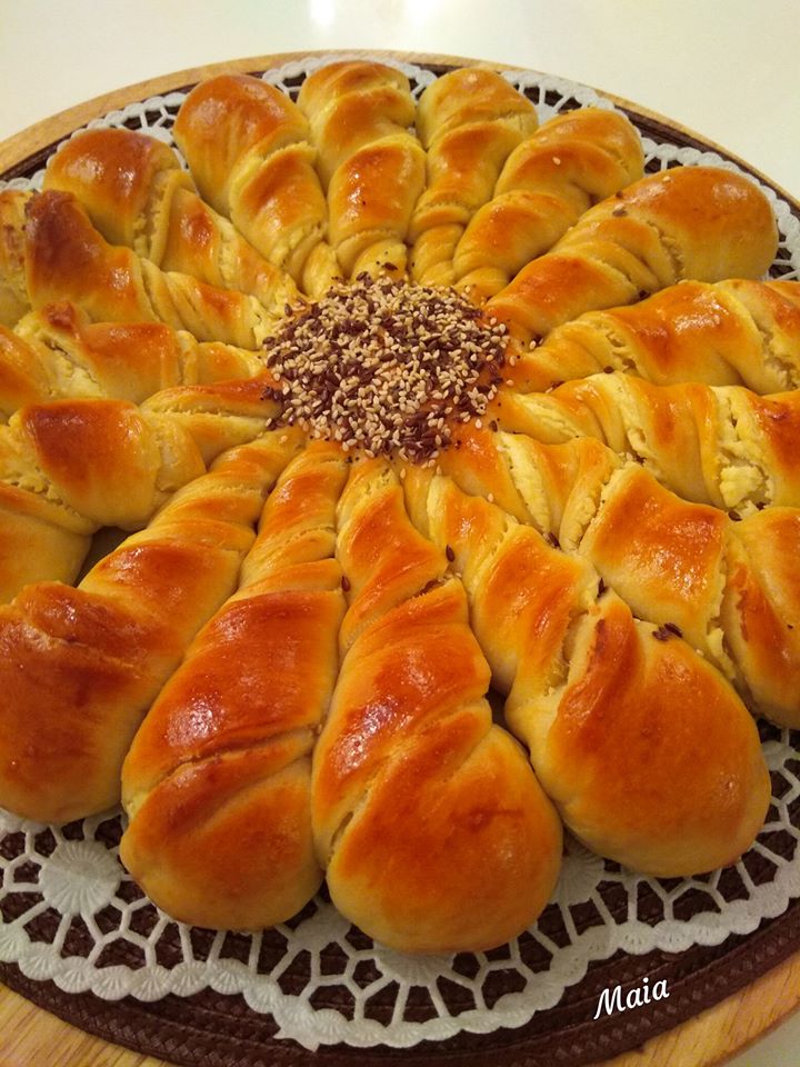 Βάζω λαδόκολλα στο ταψί, βάζω το 1 φύλλο το αλοιφω με το τυρί, βάζω και το δεύτερο από πάνω. Με ένα ποτήρι 8εκ.μαρκαρω το κέντρο. Κόβω περιστροφικά όλο το υπόλοιπο σε 16 κομματια.Το κάθε κομμάτι το στριφογυρίζω. Αλοίφω με τον κρόκο και βάζω στην μέση τα σποράκια.