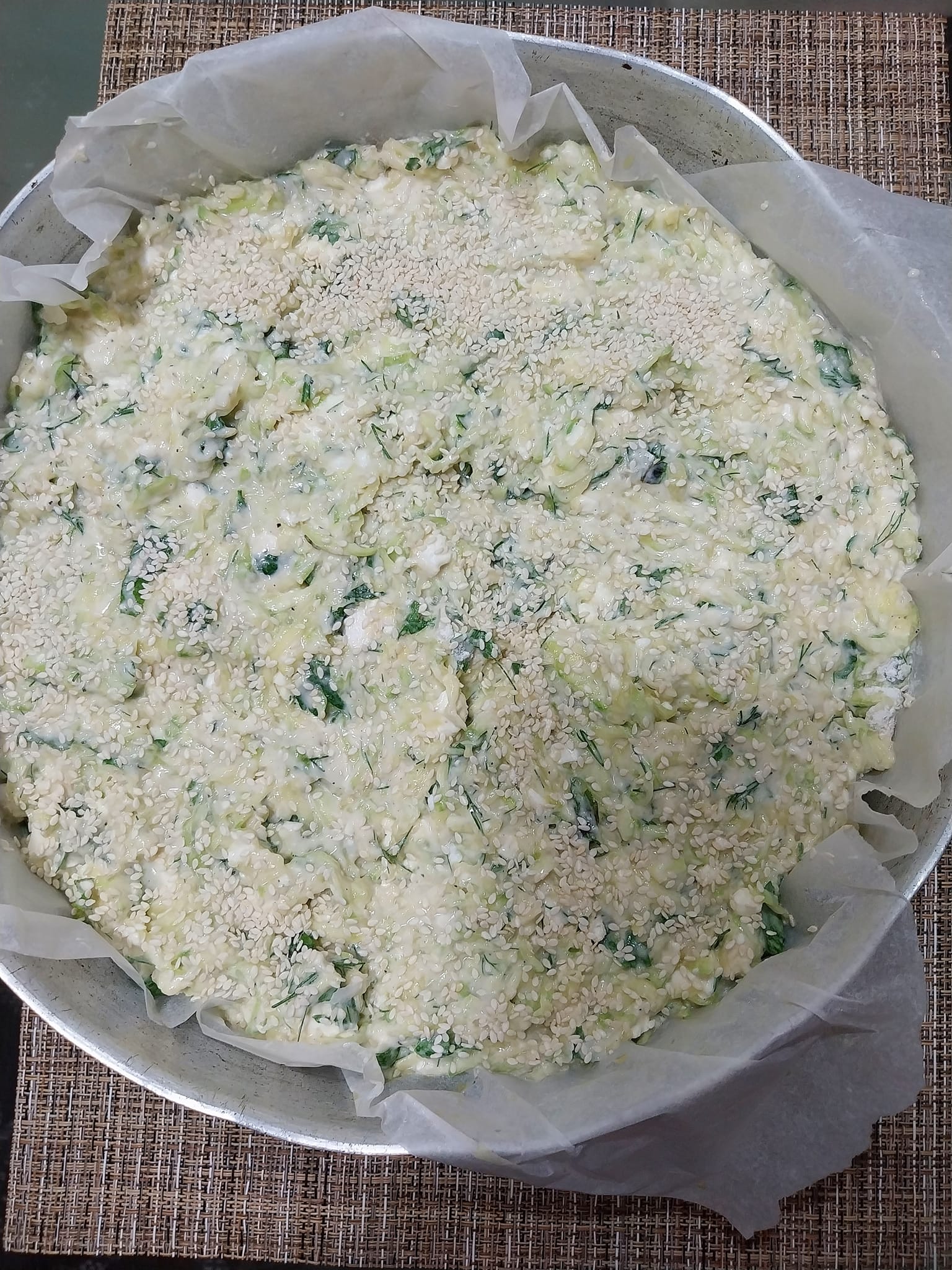Στη συνέχεια προσθέτουμε ολα τα υλικό στο τέλος το αλεύρι μέχρι να γίνει χυλος στρώνουμε λαδόκολλα εγω ριχνω λιγο σουσαμι κ απο κατω κ απο πανω