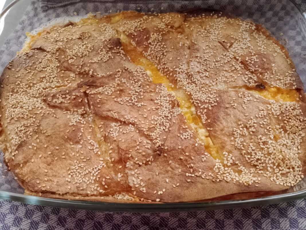 6. Αφήνω την πίτα για ένα δεκάλεπτο για να απορροφηθεί το υγρό. ραντίζω με λίγο νερό και πασπαλίζω με σουσάμι.