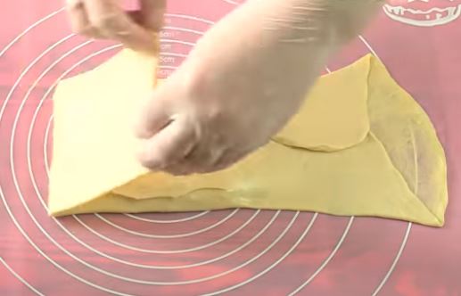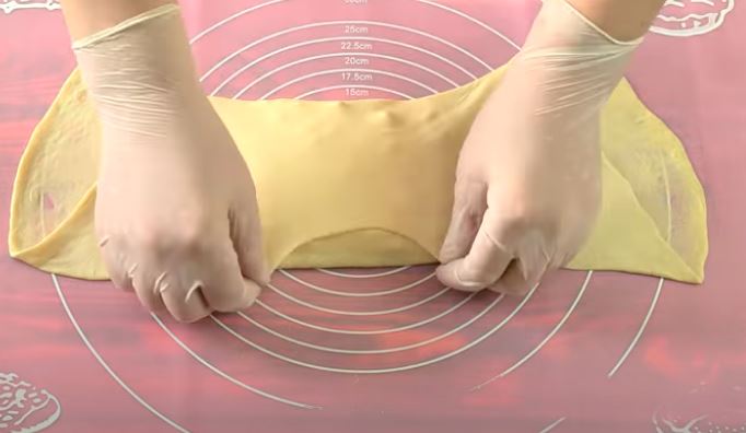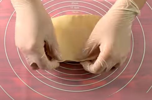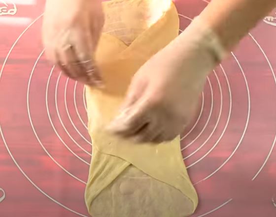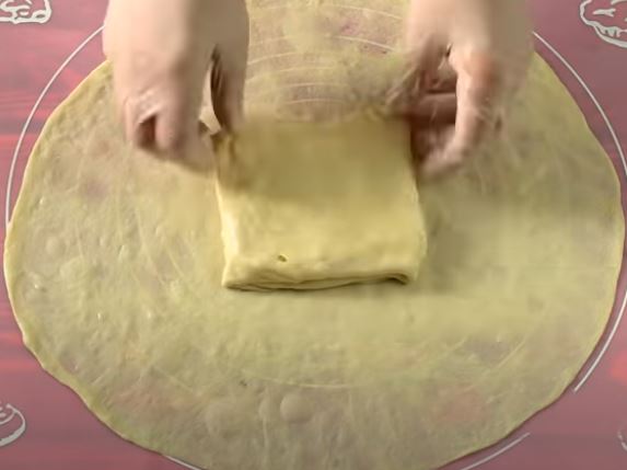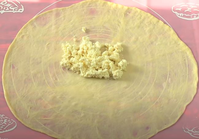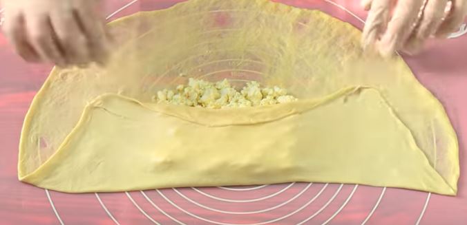 Αλείφουμε τα χέρια μας με λάδι και ανοίγουμε κάθε μπάλα σε ένα φύλλο περίπου 30 εκ βάζουμε 3 κουταλιές γέμιση . Διπλώνουμε όπως βλέπουμε στην φωτό