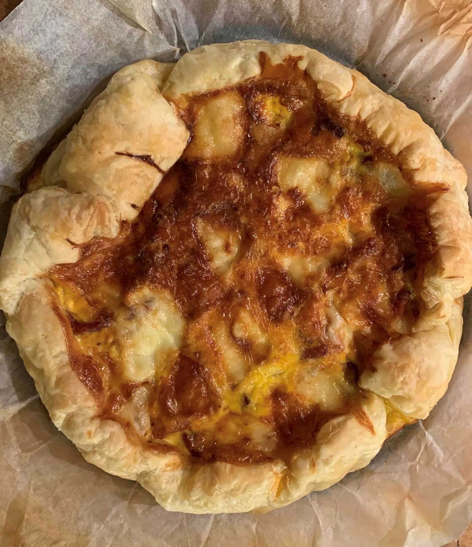 Στρώνουμε ένα ταψί με λαδόκολλα, τοποθετούμε τη ζύμη, τρυπάμε τη βάση με ένα πιρούνι, γεμίζουμε με όλο το μείγμα και κλείνουμε τις άκρες