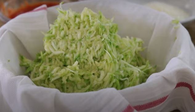 2. Τρίψτε τα κολοκύθια. Στη συνέχεια, χρησιμοποιώντας πετσέτα πιάτων, απομακρύνετε την υπερβολική υγρασία από τα κολοκύθια(κλείστε μέσα στην πετσέτα και στύψτε τα).