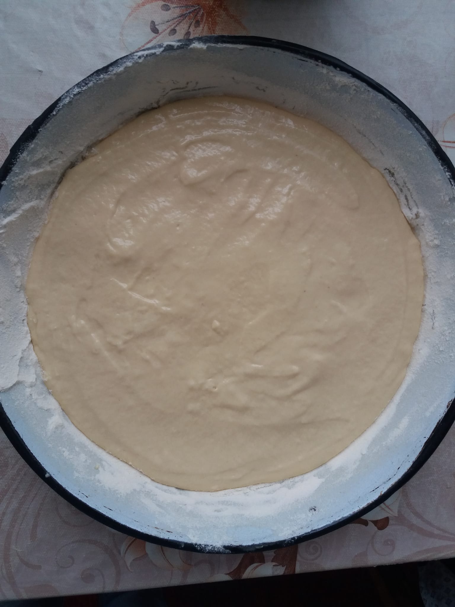Ρίχνω το μείγμα που προκύπτει σε ένα δίσκο 26 εκ., τον οποίο έχω αλείψει με βούτυρο και πασπαλίσει με λίγο αλεύρι.