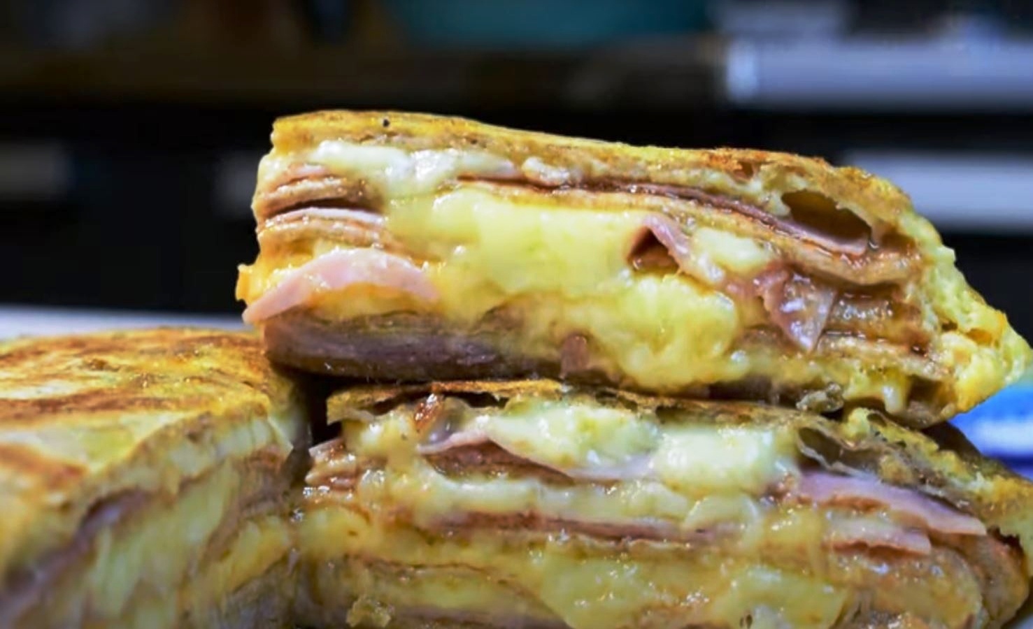Συνεχίζουμε με τορτίγια- σάλτσα – ζαμπόν – τυρί τριμμένο για 2 φορές ακόμη.