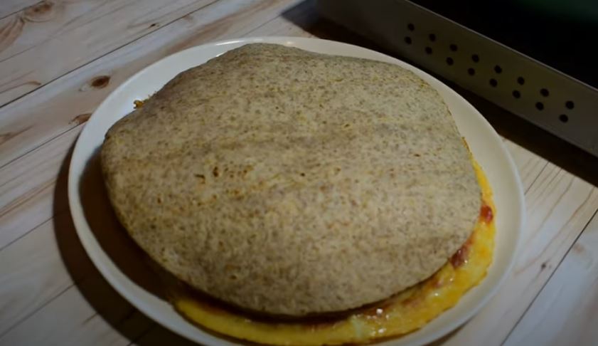 Τέλος σκεπάζουμε με την 5η τορτίγια και βάζουμε στην φωτιά για 5 λεπτά με κλειστό καπάκι το τηγάνι .
