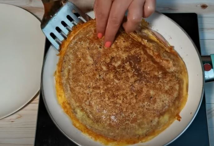 Γυρνάμε την τορτίγια από την ανάποδη πλευρά με την βοήθεια ενός πιάτου και στην ξαναβάζουμε στο τηγάνι για άλλα 5 λεπτά.