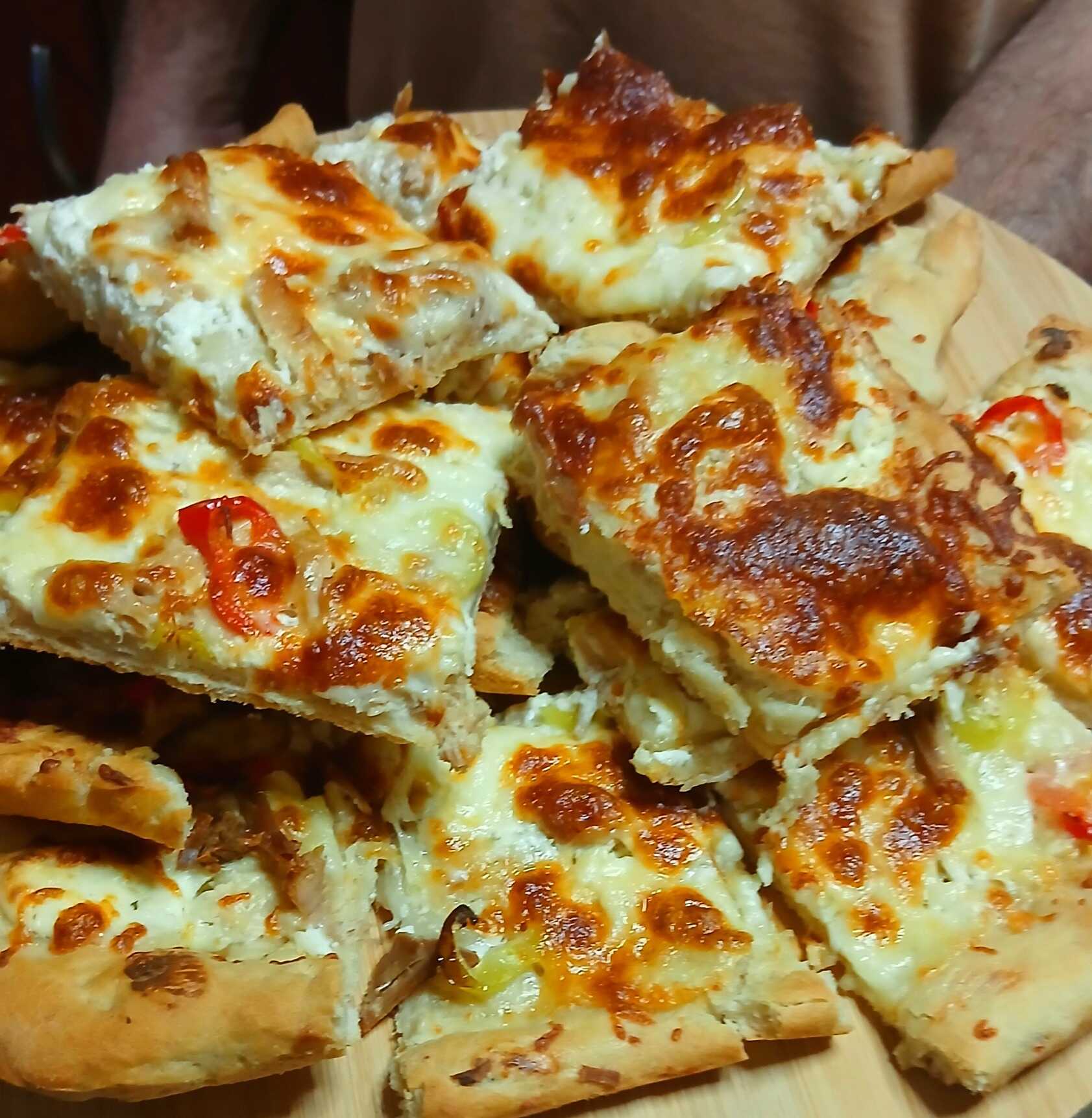 7. Ψήνω την πίτσα σε προθερμασμένο φούρνο στους 180°c μέχρι να λιώσουν τα τυριά και να πάρει ένα ωραίο χρυσαφένιο χρώμα.