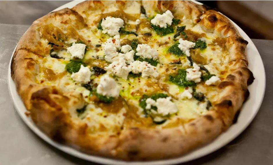Απλώστε τη σάλτσα πέστο πάνω από τη ζύμη πίτσα. Πασπαλίστε με τυρί φέτα. Προσθέστε τις προαιρετικές αγκινάρες, τις αποξηραμένες στον ήλιο ντομάτες και τις ελιές σύμφωνα με τις προτιμήσεις σας.