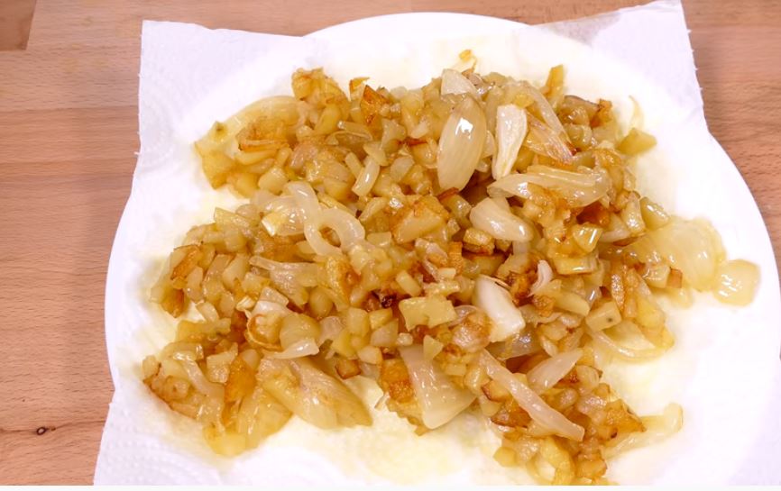Βάζουμε την πατάτα μαζί με το κρεμμύδι σε άφθονο λάδι και μαγειρεύουμε σε μέτρια φωτιά για περίπου 10 λεπτά, μέχρι να είναι πολύ μαλακό. Στη συνέχεια βγάλτε τις πατάτες με το κρεμμύδι πάνω σε απορροφητικό χαρτί. Βάλτε μια πρέζα αλάτι.