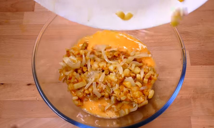 Ανακατέψτε τις πατάτες και το κρεμμύδι με το αυγό και ρίξτε το μείγμα στο τηγάνι, σε μέτρια φωτιά.