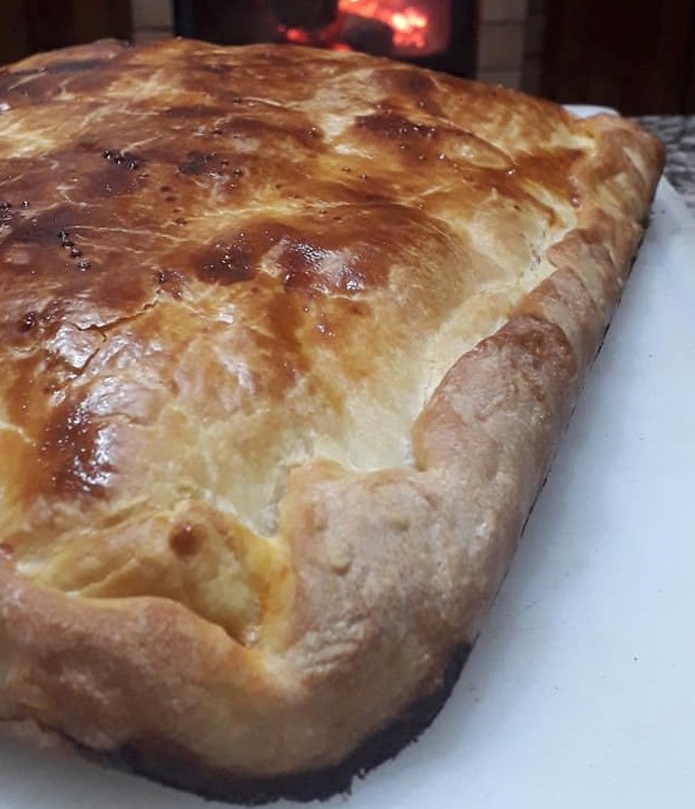 Αν θέλω να ροδίσει όμορφα η επιφάνεια, την αλείφω με χτυπημένο αυγό. Ψήνω σε προθερμασμένο φούρνο στους 200°C για περίπου 30 λεπτά. Το αφήνω να ξεκουραστεί για περίπου δέκα λεπτά πριν το κόψω και το σερβίρω.