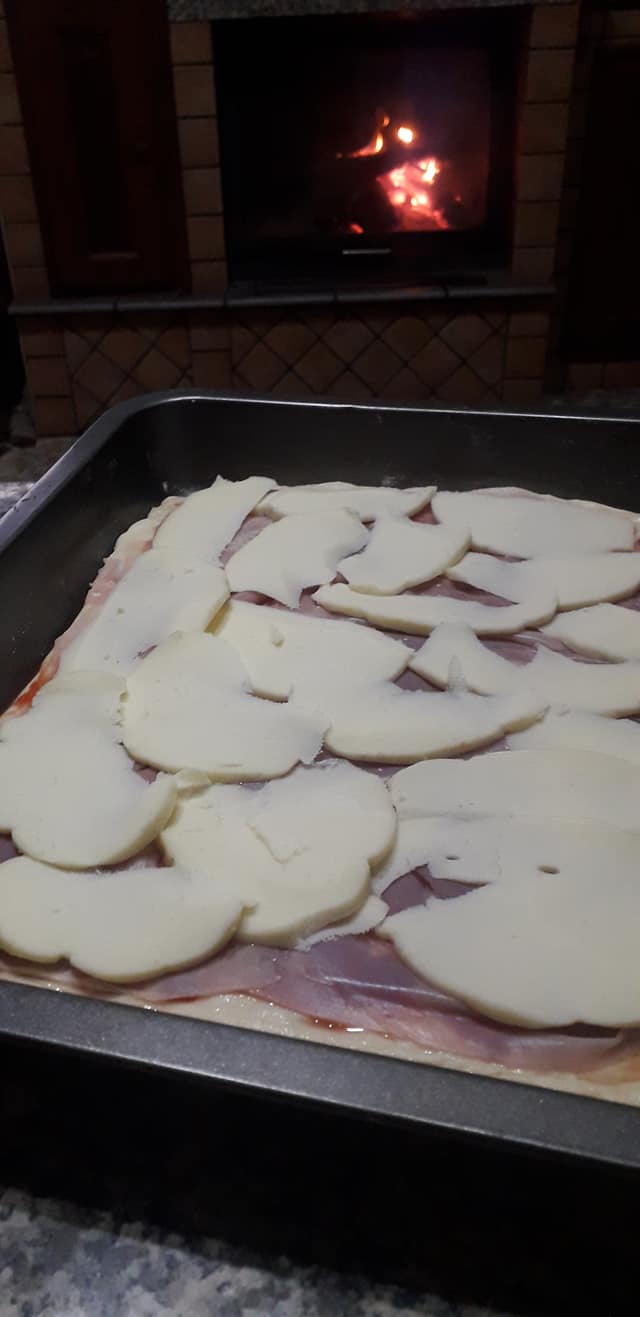 Απλώνω στη ζύμη τον μισό από τον πελτέ ντομάτας, αλατοπιπερώνω και συνεχίζω με την παρμεζάνα ή προβόλα σε φέτες και το ζαμπόν.