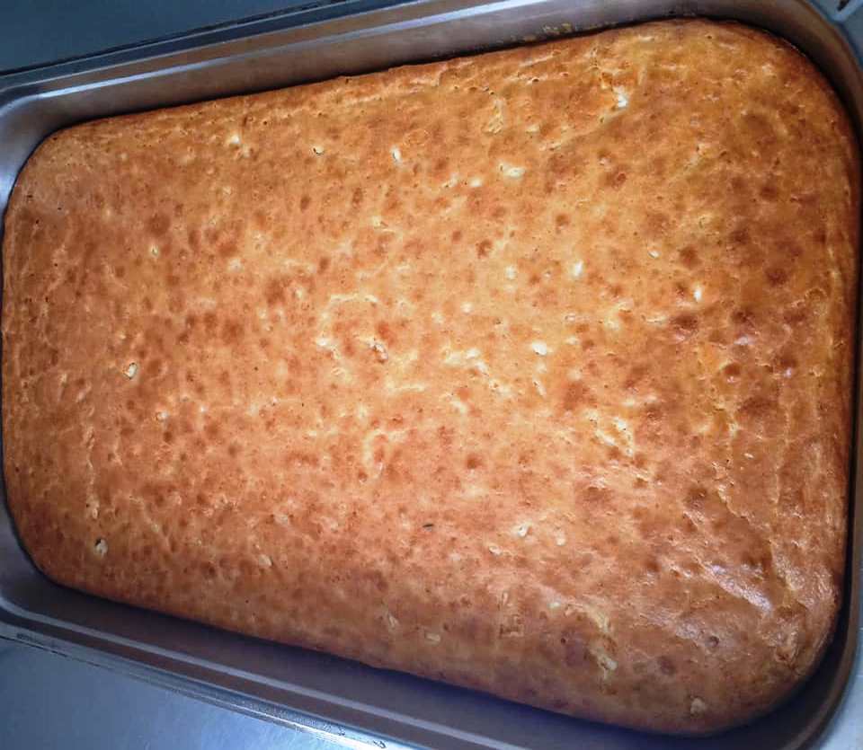 Ρίχνουμε σε βουτυρωμένο ταψί και ψήνουμε σε προθερμασμένο φούρνο στους 180-200 βαθμούς για 40 λεπτά