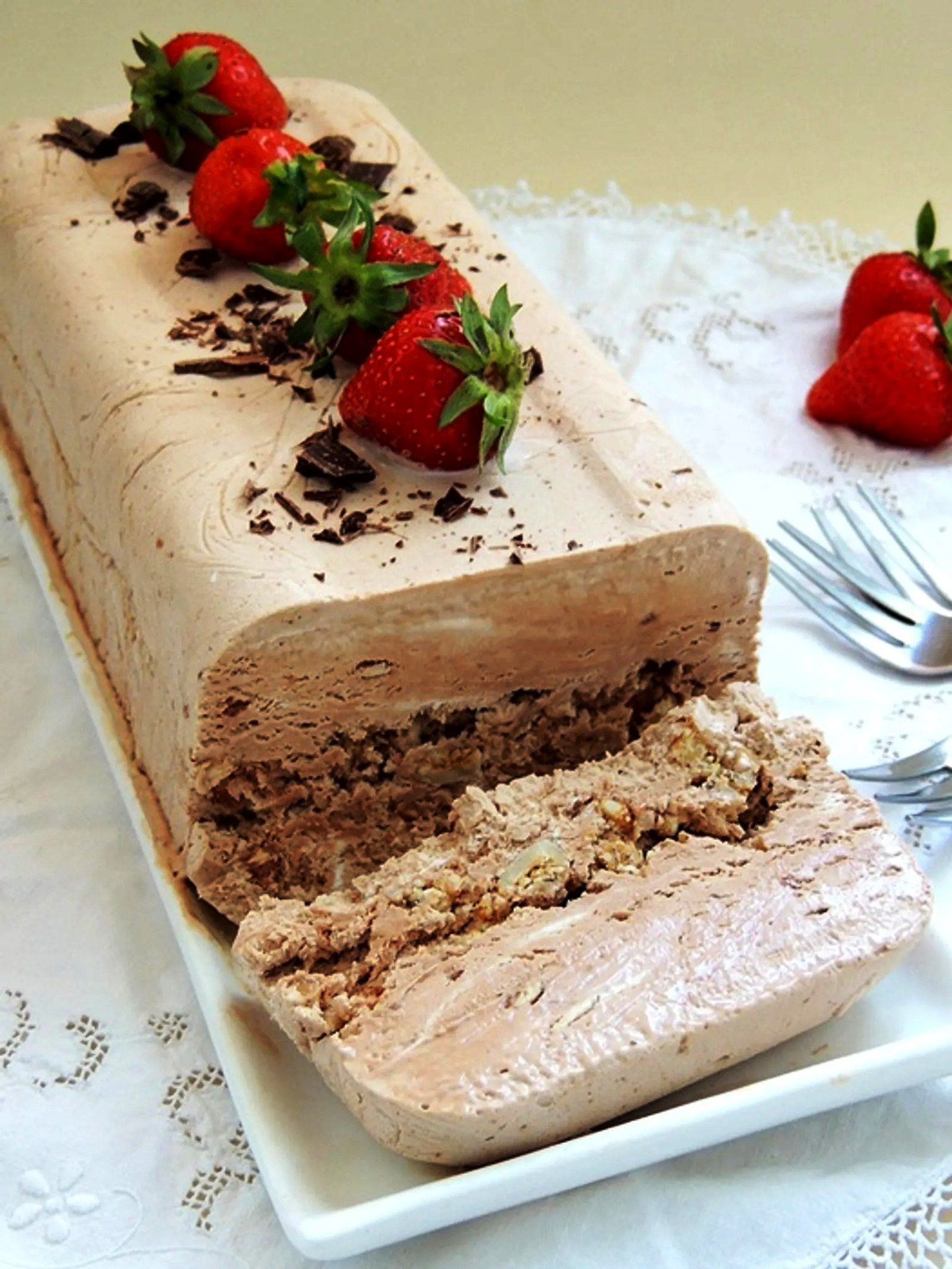 Καλύψτε το παγωτό με περιτύλιγμα και τοποθετήστε τον στον καταψύκτη για 12 ώρες. Την επόμενη μέρα καλύπτουμε με γλάσο που το έχουμε φτιάξει λιώνοντας την κουβερτούρα σε βραστό γάλα. Διακοσμούμε με σαντιγί ,κερασάκια τριμμένο αμύγδαλο ή ότι μας αρέσει.