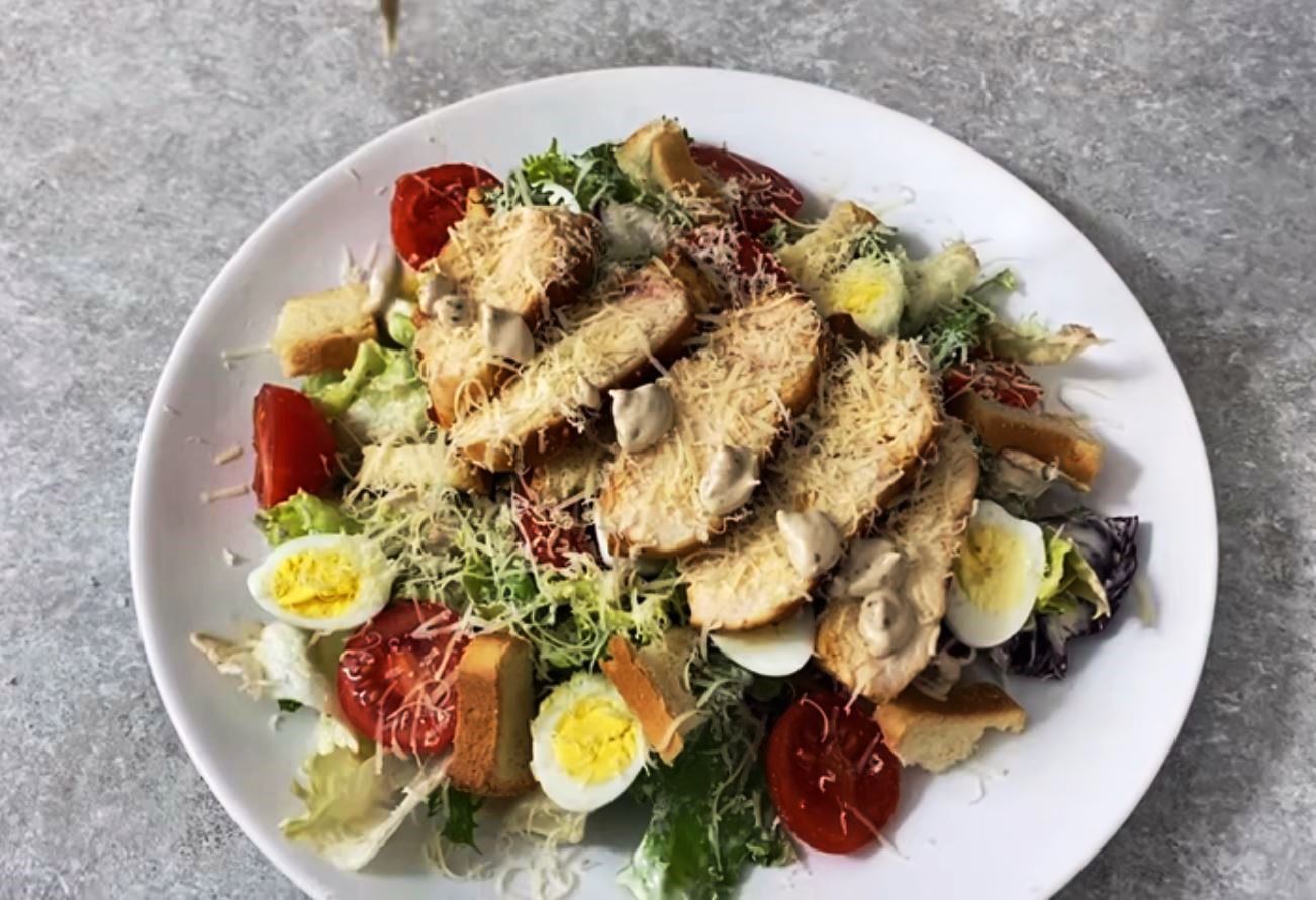 Σ ένα μεγάλο μπολ βάζουμε το μαρούλι προσθέτουμε τη σάλτσα της αρεσκείας μας ,τα ντοματίνια, τ αυγά κομμένα στη μέση,το ψωμί του τοστ κομμένο κομματάκια και από πάνω το κοτόπουλο.