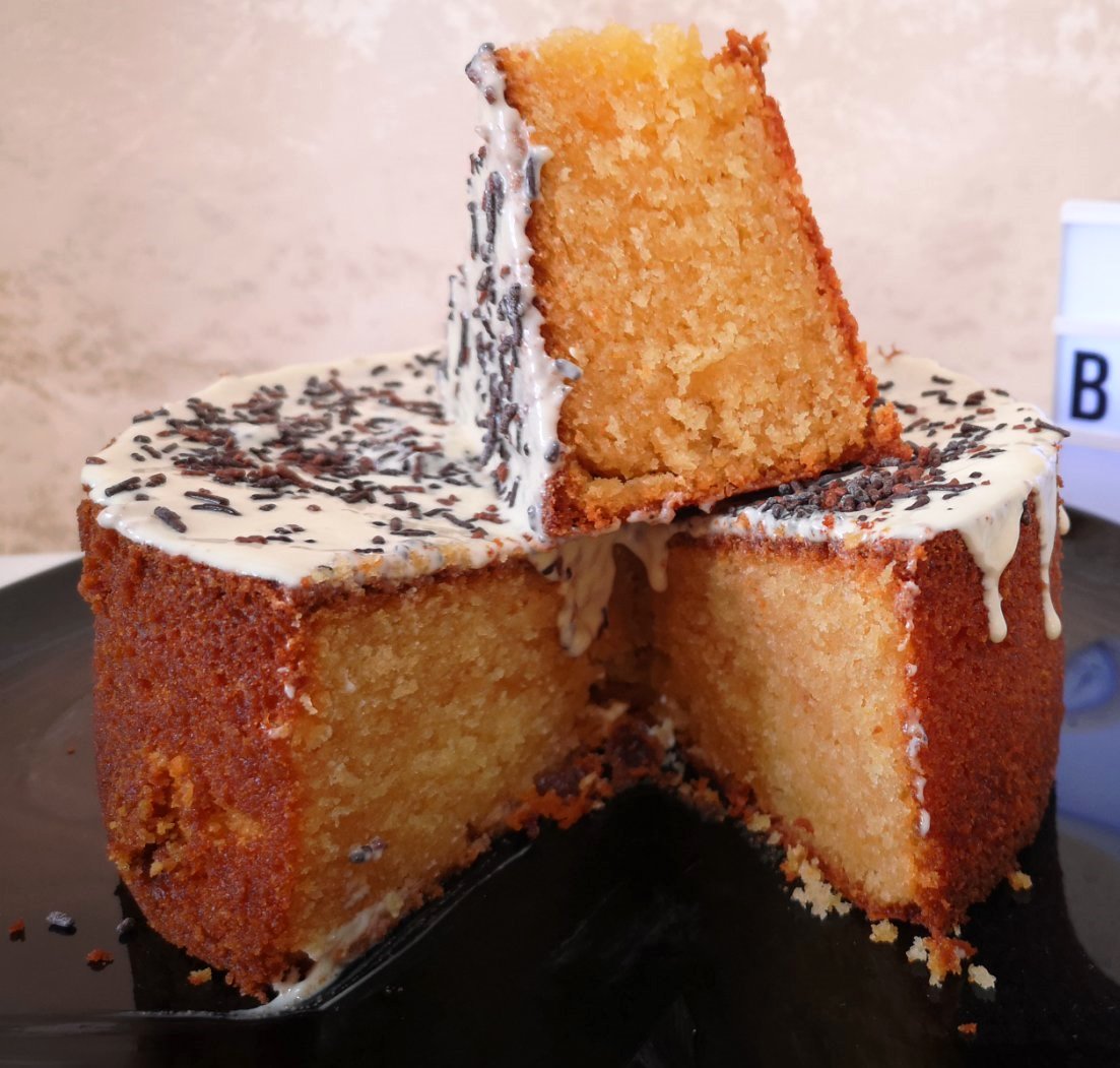 (Προσοχή επειδή αυτό το κέικ δεν έχει πολύ αλεύρι συνήθως όταν ψήνεται και κοντεύει να βγει από το φούρνο κάθεται λιγάκι στο κέντρο μη φοβηθείτε δεν έχετε αποτύχει μόλις βγει από το φούρνο και κρυώσει λιγάκι το αναποδογυρίζω ώστε η κάτω πλευρά να είναι και αυτή που θα διακοσμήσετε)