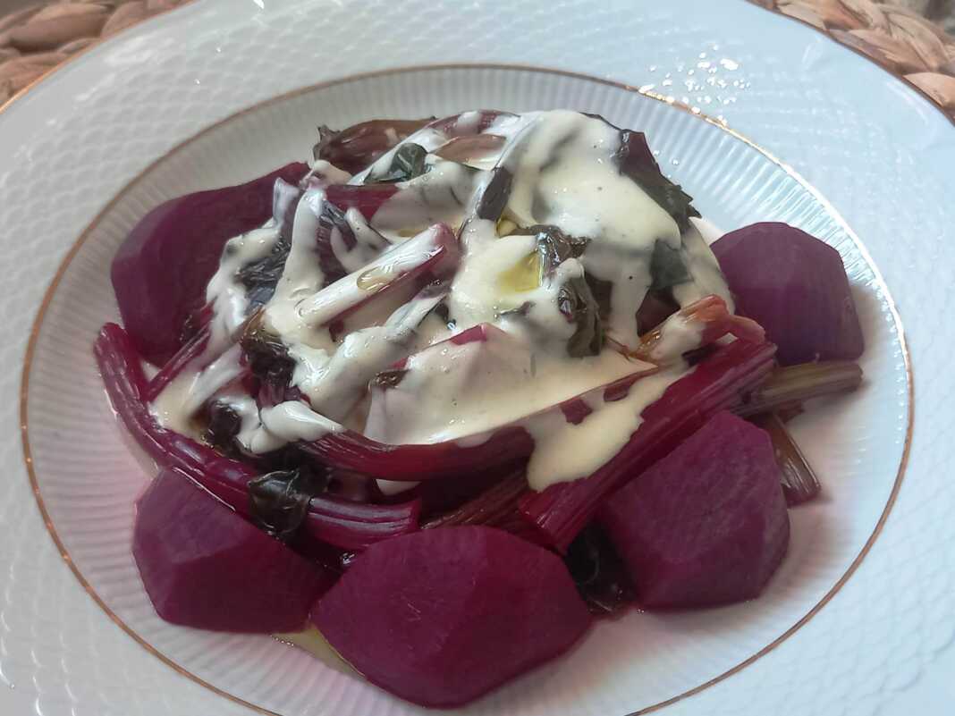 Καθαρίζουμε και πλένουμε τα παντζάρια.Κόβουμε τα φύλλα και τα κοτσάνια σε μικρότερα κομμάτια.