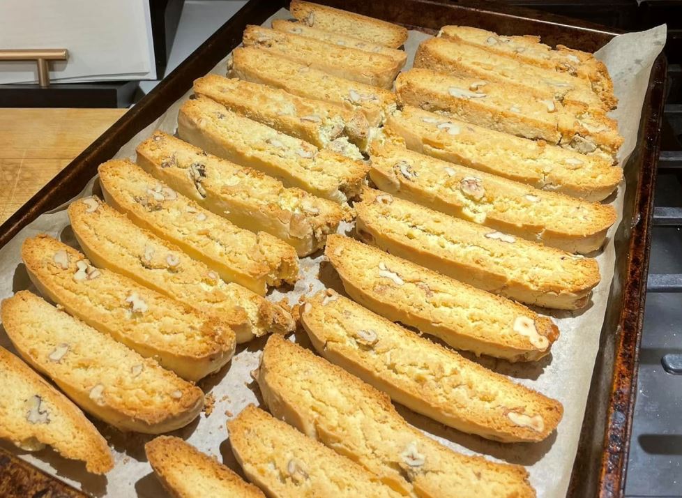 Με κοφτερό μαχαίρι, κόψτε το καθένα σε 2 εκ χοντρά μπισκότα. Καθώς κόβετε φέτες, τοποθετήστε τις κομμένες μερίδες στο ταψί,