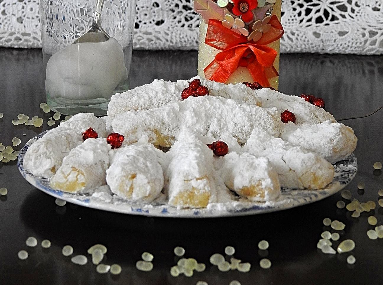 Κόβουμε σε ρολάκια μήκους 4-5 εκ. και πασπαλίζουμε με φιλέ αμυγδάλου και άχνη ζάχαρη.