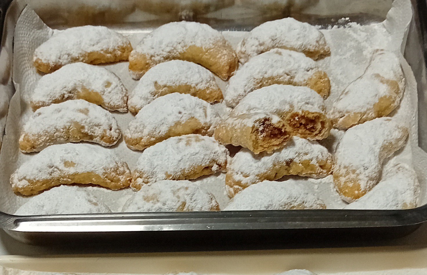 8. Τα βγάζω από τον φούρνο και τα αχνίζω με ζάχαρη άχνη όσο είναι ακόμα ζεστά.