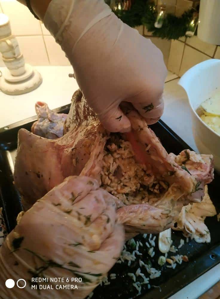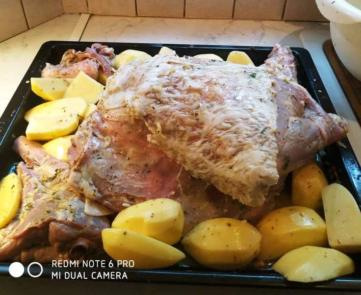 και όση ώρα την γεμίζω μαρινάρω και τις πατάτες αφού ράψω την πλάτη τα βάζω όλα στο φούρνο 250 βαθμούς κελσίου