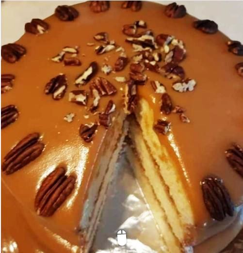 την ρίξετε πάνω απο το κέικ και διακοσμήστε με τα πεκάν η καρύδια από πάνω.