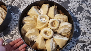 4. Από το πρώτο τμήμα, ανοίξτε  ένα φύλλο πάχος 0,5 εκ. Προσθέστε την γέμιση αν θέλετε, εγώ έβαλα τριμμένο τυρί σε όλο το φύλλο. Τυλίξτε το σε ρολό.