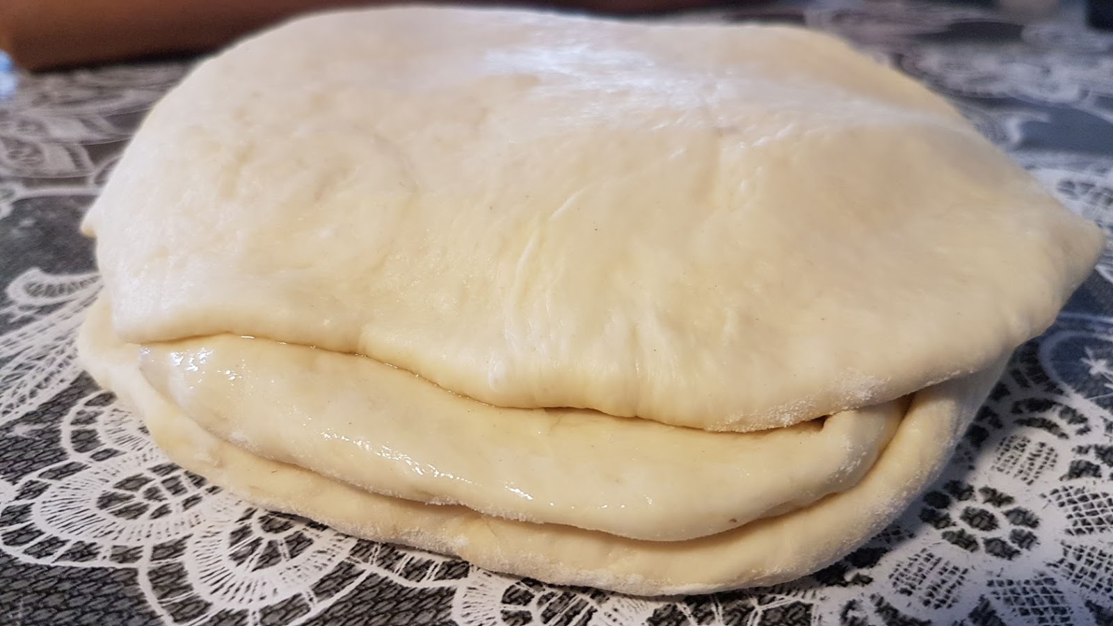 2. Κάθε μπαλάκι ανοιξτε το σε μια μικρή πλάκα μεγέθους όπως ενός δίσκου. Τοποθετήστε 4 δίσκους το ένα πάνω από το άλλο, επικαλυμμένα με λιωμένο βούτυρο. Μην βάζετε τίποτα στον τελευταίο δίσκο. Τοποθετήστε τα για λίγο στην κατάψυξη για να σκληρύνει το βούτυρο.