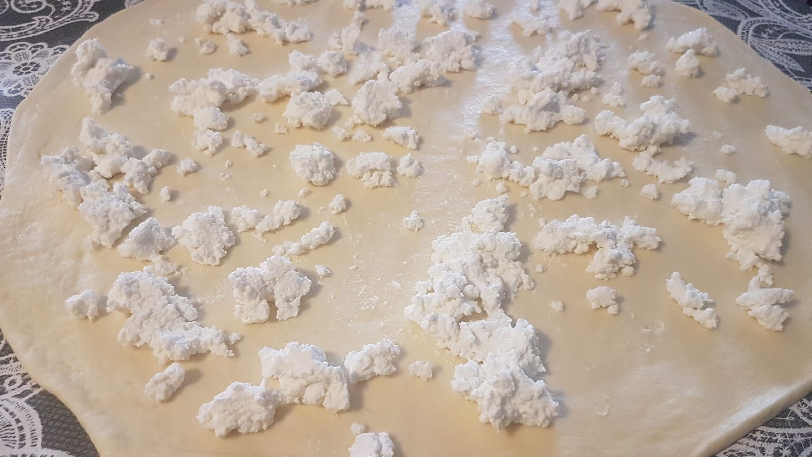 4. Από το πρώτο τμήμα, ανοίξτε  ένα φύλλο πάχος 0,5 εκ. Προσθέστε την γέμιση αν θέλετε, εγώ έβαλα τριμμένο τυρί σε όλο το φύλλο. Τυλίξτε το σε ρολό.