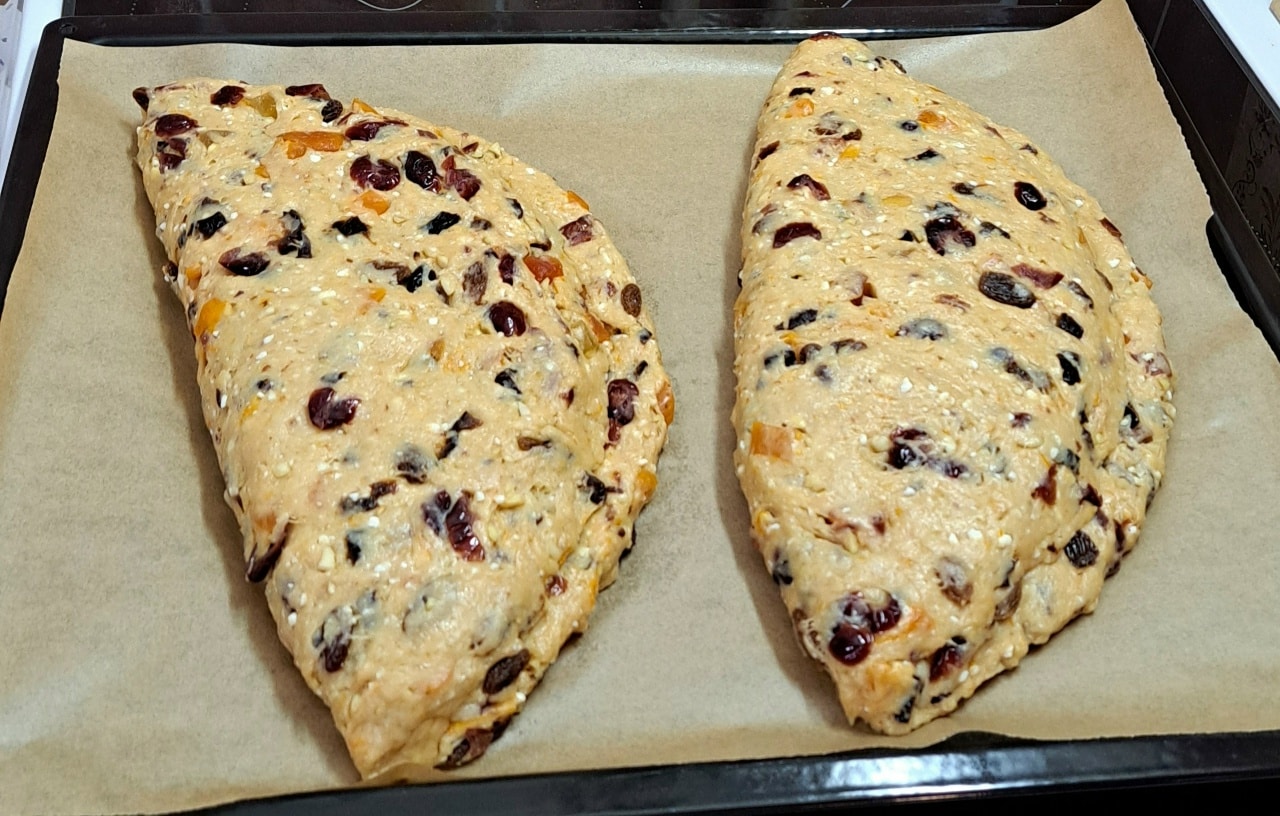 Πασπαλίζουμε τον πάγκο με αλεύρι και τεντώνουμε τη ζύμη σε μια στρώση . Δημιουργούμε το χαρακτηριστικό σχήμα Stollen ( με τη μια πλευρά την διπλώνουμε πάνω στην άλλη)