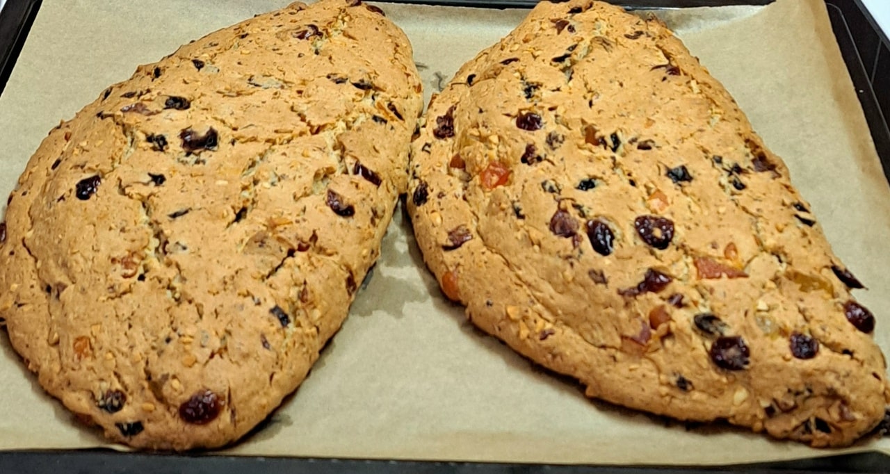 Σε ένα άλλο μπολ, ανακατεύουμε το αλεύρι , το μπέικιν πάουντερ , την κανέλα , το κάρδαμο , το τζίντζερ και το μοσχοκάρυδο . Προσθέτουμε το αλεύρι στα υγρά και ανακατεύουμε με το μίξερ μέχρι να σχηματιστεί μια μαλακή ζύμη . Στο τέλος, προσθέτουμε τα αποξηραμένα φρούτα , τους ξηρούς καρπούς και τα ζαχαρωμένα φρούτα και ζυμώνουμε με το χέρι για να ενσωματωθούν.