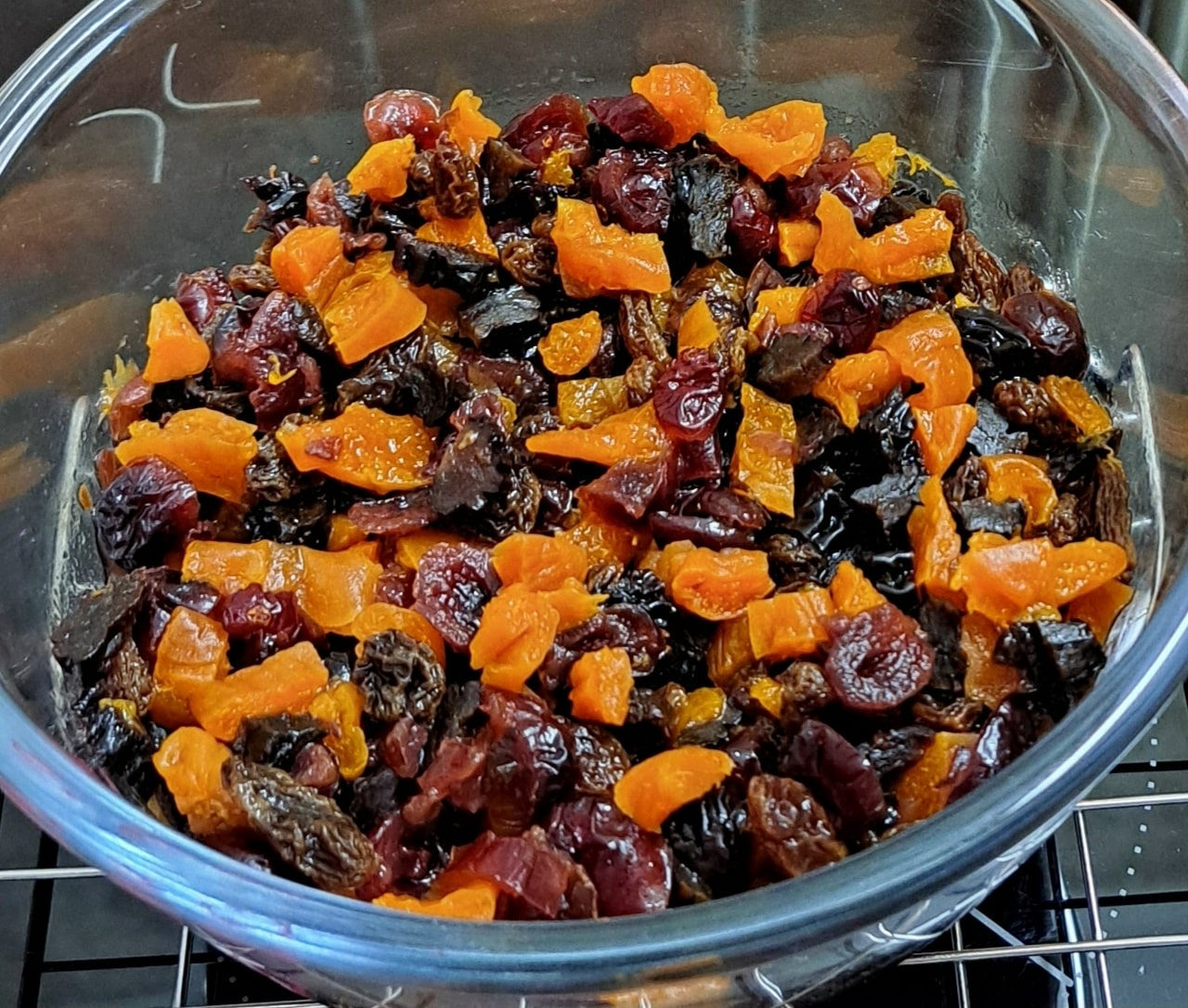 Ρίχνουμε σε βραστό νερό όλα τα αποξηραμένα φρούτα για 5 λεπτά . Τα ξεπλένουμε και τα στεγνώνουμε, κόβοντάς τα σε μικρά κομμάτια. Βάζουμε όλα τα αποξηραμένα φρούτα σε ένα μπολ και τα περιχύνουμε με το αλκοόλ ( ρούμι , λικέρ , κονιάκ ή βραστό χυμό πορτοκαλιού ). Τα αφήνουμε να μουλιάσουν για αρκετές ώρες ή όλη τη νύχτα , ανακατεύοντας περιστασιακά.