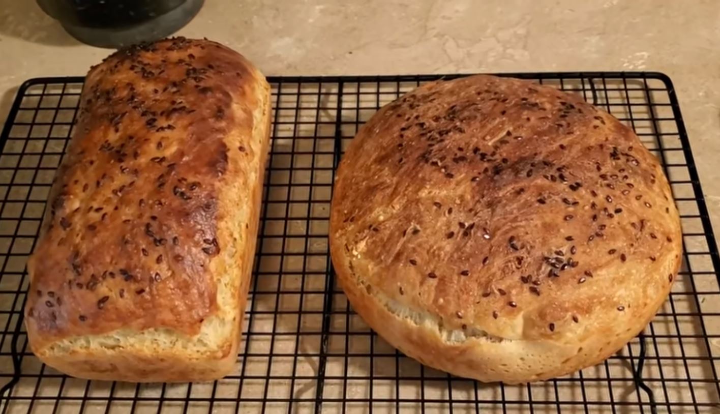 Μετά αλείφουμε τη φόρμα μας με λάδι και με μία σπάτουλα σιλικόνης αδειάζουμε τη ζύμη μέσα στη φόρμα σκεπάζουμε τη ζύμη με μία πετσέτα για 5 λεπτά πασπαλίζουμε με σουσάμι και βάζουμε τη φόρμα στο φούρνο να ψηθεί για 40-45 λεπτά όταν το βγάλουμε το ψωμάκι μας είναι έτοιμο