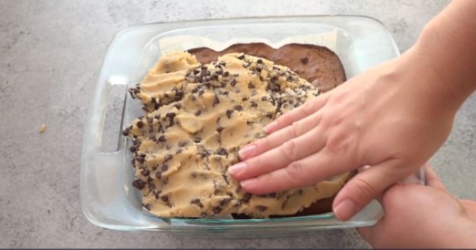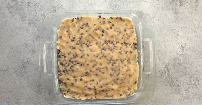 Σε ένα μεγάλο μπολ, χρησιμοποιήστε ένα ηλεκτρικό μίξερ για να συνδυάσετε το βούτυρο, την ζάχαρη και το αλάτι μέχρι να μαλακώσουν και να κρεμώσουν (1 έως 2 λεπτά). Ανακατέψτε το γάλα και τη βανίλια. Πασπαλίζουμε το αλεύρι και ανακατεύουμε μέχρι να συνδυαστούν. Ανακατέψτε το 1 φλιτζάνι τσιπ σοκολάτας. Βάλτε το μείγμα πάνω από την βάση και απλώστε τη. Θεωρώ ότι είναι πιο εύκολο να το κάνουμε αυτό εάν το στρώμα βάσης είναι παγωμένο και σταθερό. Βρέξτε τα χέρια σας και κάντε μια πιεσμένη ομοιόμορφη στρώση.